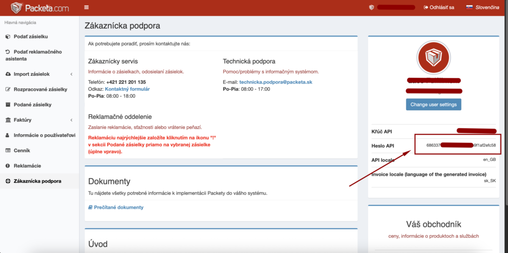 a) Pre získanie API hesla navštívte stránku https://client.packeta.com/sk/support, prihláste sa do Vášho partnerského účtu Packeta a skopírujte tento údaj:
