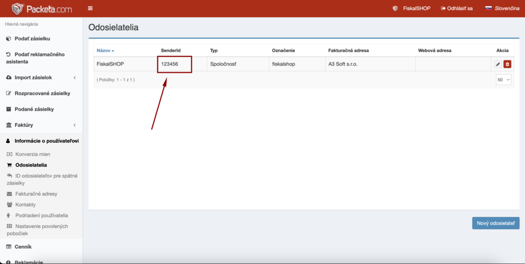 b) Pre získanie ID odosielateľa navštívte stránku https://client.packeta.com/sk/senders a skopírujte číslo SenderId: