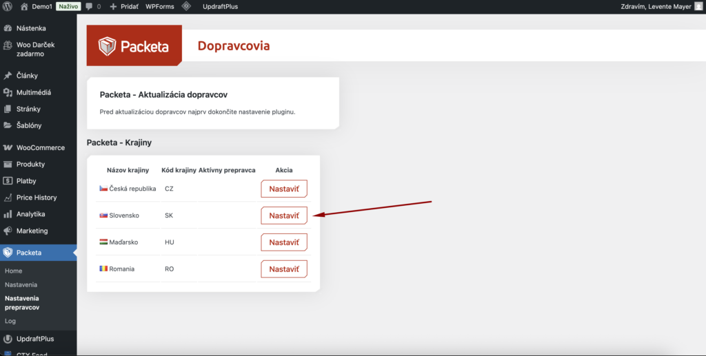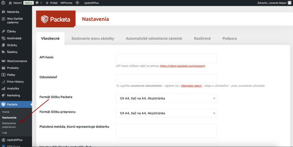 4. Keď máte všetko nastavené, kliknite v menu na Packeta > Nastavenia prepravcov.