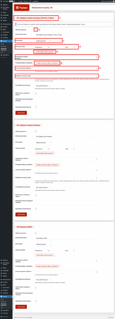 d) V týchto políčkach nastavujete jednotlivé pravidlá, napríklad: do 1 kg cena bude 5 EUR.